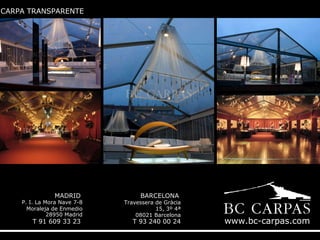 El documento presenta información sobre carpas, específicamente carpas transparentes y tapizadas, disponibles en Madrid y Barcelona. Se incluyen direcciones y números de contacto para ambas ubicaciones, además de un sitio web. Se repite la información sobre las carpas en varias ocasiones.