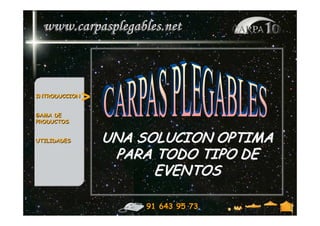 Este documento presenta una empresa que ofrece una gama de carpas ligeras y resistentes para todo tipo de eventos. Describe su línea de productos V2, V3 y V4, destacando las ventajas de las carpas V3 como su estructura de aluminio, varias dimensiones y buena relación calidad-precio. También menciona los usos de las carpas para particulares, fiestas, celebraciones, hostelería, restaurantes y ferias.