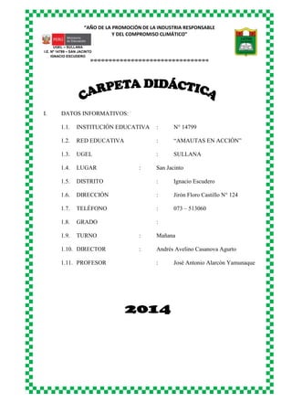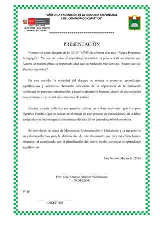 El documento presenta información sobre la Institución Educativa No 14799 en San Jacinto, Perú. Incluye datos sobre la ubicación, autoridades y características de los estudiantes. También describe la propuesta pedagógica de la escuela, la cual se basa en principios de formación humana y respeto por los estudiantes. Además, presenta el reglamento interno del aula, el cual establece deberes, sanciones y estímulos para los estudiantes.