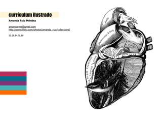 El documento presenta el currículum de Amanda Ruiz Méndez, que incluye proyectos de obra nueva, remodelación, escenografía, museografía y mobiliario realizados entre 2002 y 2012. Los proyectos abarcan desde residencias privadas y restaurantes hasta parques industriales, salas de exhibición y edificios de interés social.
