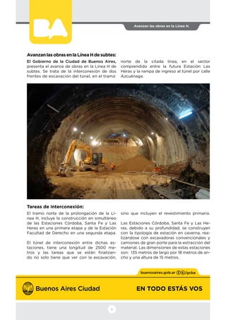 El gobierno de la Ciudad de Buenos Aires presenta el avance de las obras en la Línea H del subte. Se ha logrado interconectar dos frentes de excavación del túnel entre la futura estación Las Heras y la entrada al túnel por la calle Azcuénaga. El túnel tendrá una longitud de 2500 metros e incluirá las estaciones Córdoba, Santa Fe y Las Heras. Recientemente se inauguró la estación Hospitales, extendiendo la red de subtes al sur de la ciudad.