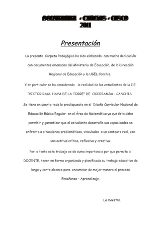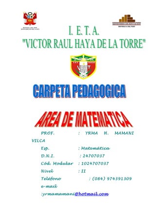 Este documento presenta la carpeta pedagógica de la profesora Yrma Mamani para la asignatura de matemáticas en la Institución Educativa "Victor Raul Haya de la Torre" en Occobamba, Perú. Incluye información personal de la profesora, datos de la institución, bases legales, perfiles de docentes y estudiantes, visión, misión, normas de convivencia y el calendario comunal local. El objetivo es organizar el trabajo educativo del profesor para mejorar el proceso de enseñanza-aprendiz