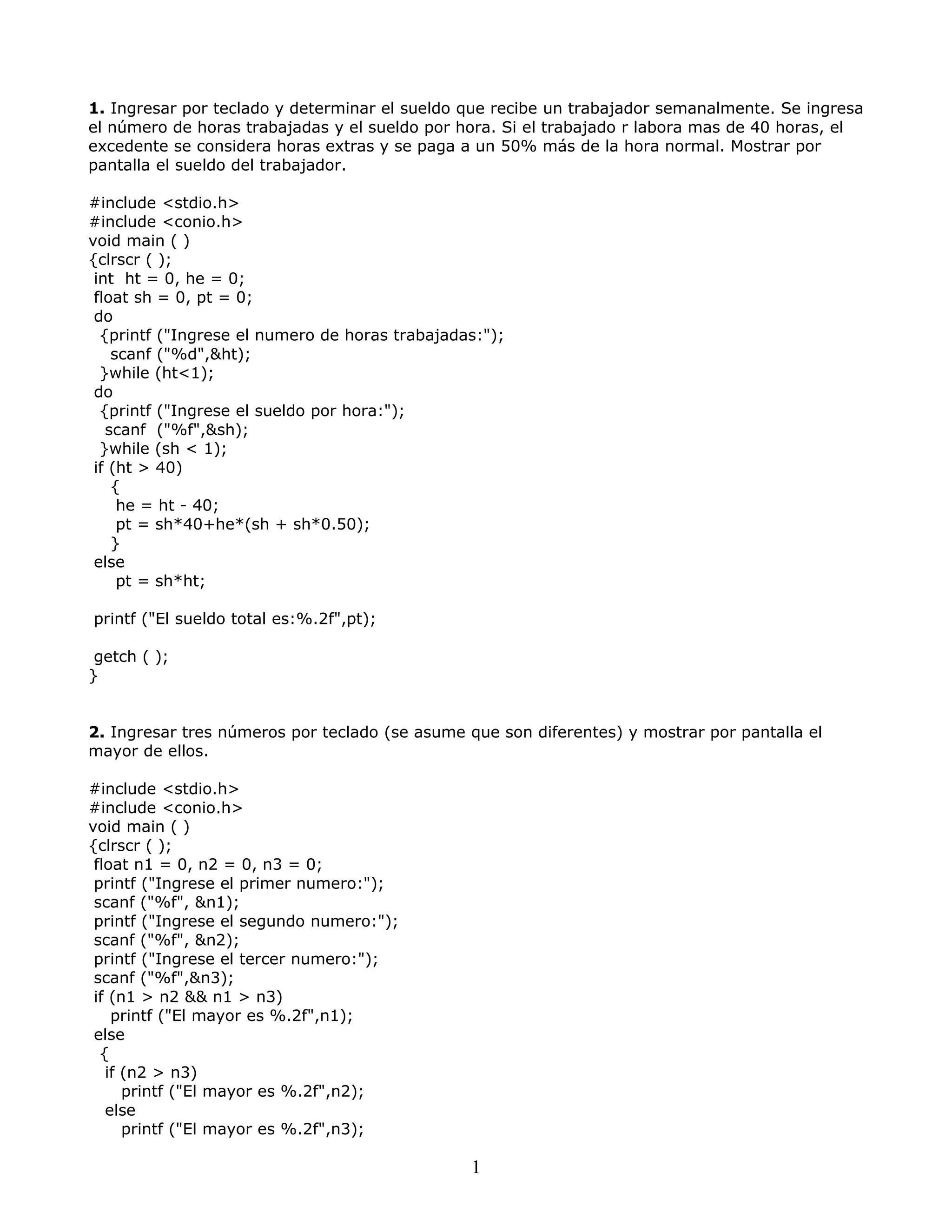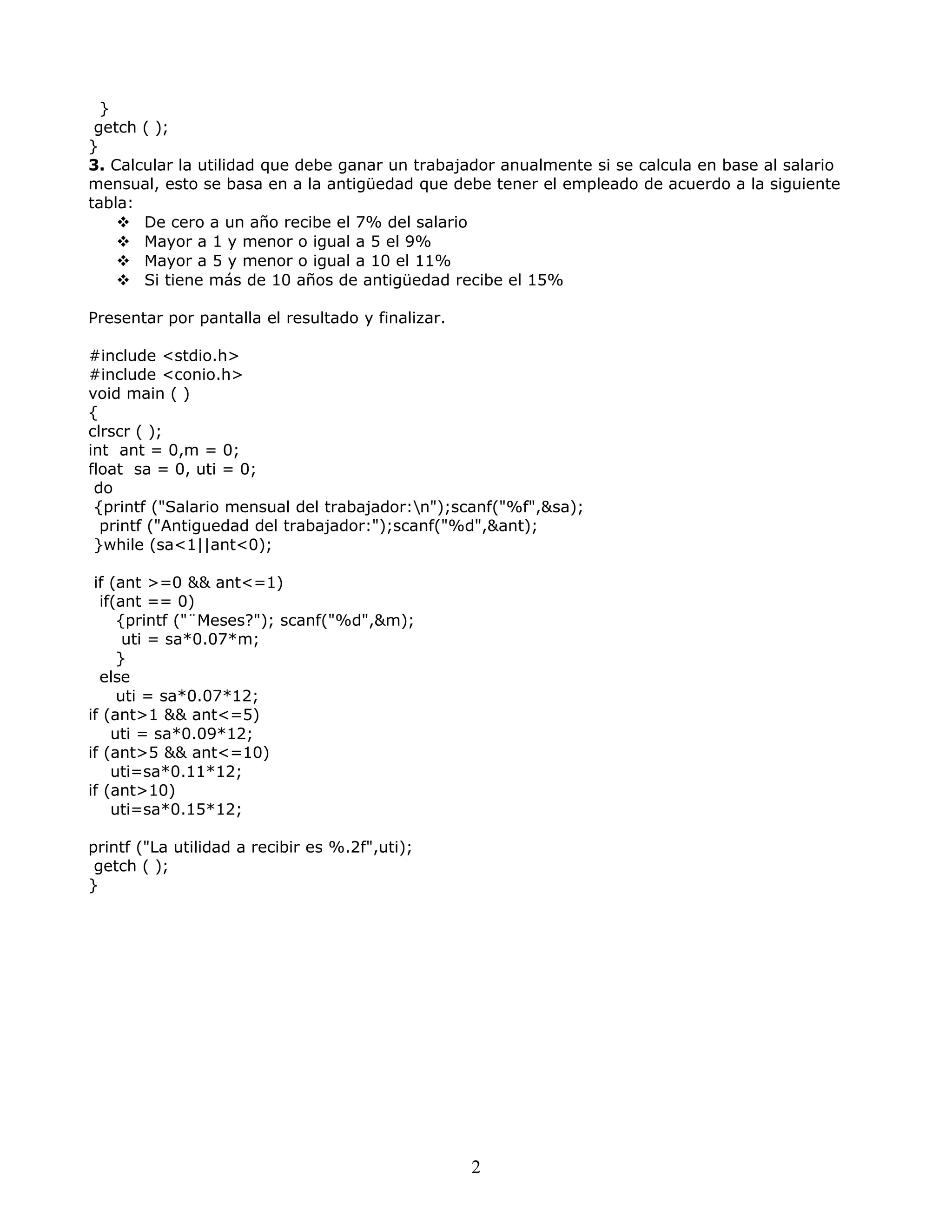1. El documento presenta 15 programas en C que resuelven diferentes problemas matemáticos y lógicos, como calcular el sueldo de un trabajador, determinar el mayor de tres números ingresados, calcular la utilidad anual de un empleado en base a su antigüedad, entre otros. Los programas utilizan estructuras de control como condicionales y ciclos para ingresar y procesar datos, y mostrar resultados por pantalla.