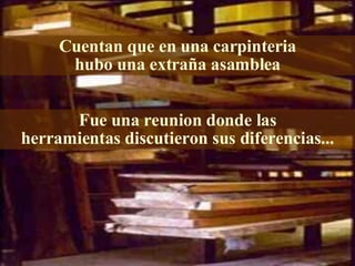 Las herramientas de un carpintero discuten sus defectos y se quejan unas de otras, pero cuando el carpintero las usa para trabajar, demuestran que cada una tiene cualidades valiosas. El serrucho les aconseja concentrarse en sus puntos fuertes en lugar de sus debilidades. Al darse cuenta de cómo trabajan juntas para crear muebles de calidad, las herramientas se sienten como un equipo capaz de producir cosas de valor.
