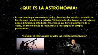 Este documento describe la carrera de astronomía. La astronomía estudia el universo, incluyendo planetas, estrellas, cúmulos, nebulosas y galaxias. Los estudios de astronomía duran alrededor de 9 semestres y se enfocan en matemáticas, física y astronomía. Los estudiantes de astronomía necesitan habilidades en física, matemáticas y computación. Los astrónomos investigan el universo mediante observaciones y trabajan en universidades, observatorios y empresas tecnol