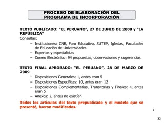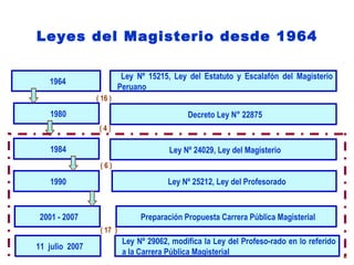 El documento detalla la Ley N° 29062 de la Carrera Pública Magisterial en Perú, que regula la carrera docente y establece un sistema de evaluación, ingreso y ascenso basado en méritos y capacidades. Incluye un resumen histórico de legislación relacionada desde 1964, procesos de consulta y propuestas, además de los requisitos y procedimientos para profesores en distintos niveles educativos. También se abordan derechos, deberes, sanciones y aspectos sobre la remuneración de los docentes.
