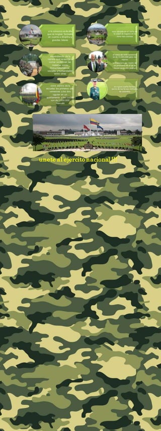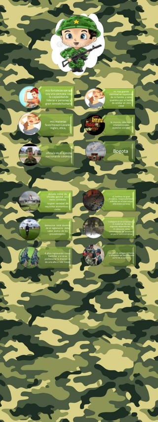 Este documento describe las fortalezas, debilidades y aspiraciones de un candidato para unirse al ejército nacional de Colombia. El candidato destaca su capacidad de liderazgo y sentido humano entre sus fortalezas, mientras que separarse de su familia es su mayor debilidad. El documento también proporciona detalles sobre la Escuela Militar de Oficiales General José María Córdova, como sus requisitos, costos y ubicación en Bogotá.