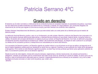 El documento trata sobre el concepto de derecho. Explica que el derecho es el orden normativo e institucional que regula la conducta humana en sociedad basado en principios de justicia. Además, existen diversas interpretaciones sobre el derecho y para que exista, cada persona debe ceder parte de su libertad al estado de derecho. Finalmente, define el derecho positivo como el conjunto de leyes y normas creadas por el estado para mantener el orden social.