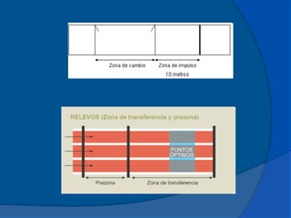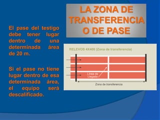 Este documento describe las carreras de relevos en atletismo. Explica que las carreras de relevos consisten en que cuatro corredores completan una distancia determinada pasándose un testimonio. Las distancias olímpicas son 4x100m y 4x400m. También resume brevemente el origen histórico de las carreras de relevos, las técnicas de entrega del testimonio, y los aspectos reglamentarios de estas pruebas.