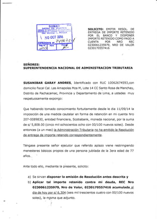 El solicitante, un jubilado de 77 años, pide a la Superintendencia Nacional de Administración Tributaria que emita una resolución para entregarle un importe de 5,808 soles que fue retenido de su cuenta bancaria hace un mes y que aplique dicho importe como pago a cuenta de una deuda tributaria por 5,304 soles. Adjunta los documentos que acreditan la deuda.