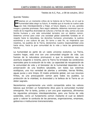 El documento es una carta sobre el cuidado al medio ambiente. Resalta que la humanidad se encuentra en un momento crítico donde debe elegir su futuro y reconocer que somos una sola familia humana que comparte un destino común. Propone unirse para crear una sociedad global sostenible basada en el respeto a la naturaleza, los derechos humanos y la justicia económica. También enfatiza la necesidad de proteger la vitalidad y diversidad de la Tierra, así como desarrollar una visión compartida sobre valores básicos que