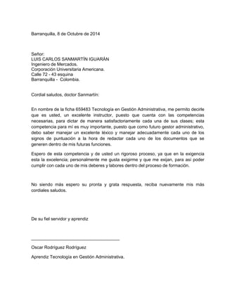 El estudiante Oscar Rodríguez Rodríguez escribe al profesor Luis Carlos Sanmartín para elogiar sus habilidades como instructor, ya que posee las competencias necesarias para dictar sus clases de manera satisfactoria. Rodríguez también expresa que desea un proceso riguroso con el profesor Sanmartín, ya que cree que en la exigencia está la excelencia, y que le gusta exigirse a sí mismo y que lo exijan para cumplir con sus deberes como aprendiz de Tecnología en Gestión Administrativa.