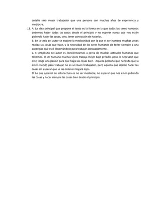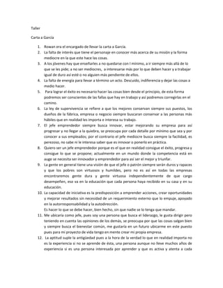 El documento describe varios temas relacionados con el liderazgo y el desempeño laboral. Resalta la importancia de no conformarse con lo mínimo, ir más allá de lo requerido, y completar las tareas bien hechas sin necesidad de supervisión. También destaca la diferencia entre jefes emprendedores e innovadores, en contraste con jefes mediocres y perezosos.