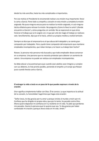 Este documento resume el ensayo "Carta a García" escrito en 1899 por Elbert Hubbard. El ensayo usa la historia de un hombre llamado Rowan, quien entregó una carta al general cubano Calixto García durante la guerra de independencia de Cuba, para ilustrar la importancia de la iniciativa y el cumplimiento del deber sin excusas. Resalta las cualidades de Rowan como empleado competente y capaz de completar las tareas asignadas sin supervisión y ofrece el ensayo como inspiración para ser más proactiv