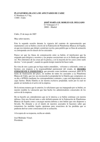 El presidente de la Plataforma Blanca de Afectados de Cádiz le escribe al abogado José María Gil Robles para expresar su insatisfacción con la falta de comunicación entre el bufete y las asociaciones. Solicita que el bufete presente un incidente concursal para reconocer que la filatelia comprada por los asociados a AFINSA es de su propiedad exclusiva, y que impugne la valoración de los activos hecha por los administradores concursales. Advierten que si no cumplen con estas solicitudes, abandonarán la Federación de Pl