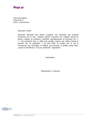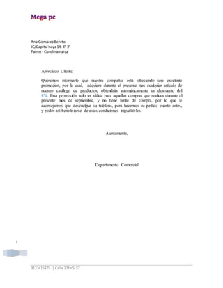 La compañía está ofreciendo una promoción durante el mes de septiembre donde los clientes recibirán descuentos de entre el 6% al 15% al realizar compras de cualquier artículo de su catálogo de productos. La promoción no tiene límite de compra y los clientes son aconsejados comunicarse cuanto antes para hacer sus pedidos y aprovechar las condiciones de la promoción.