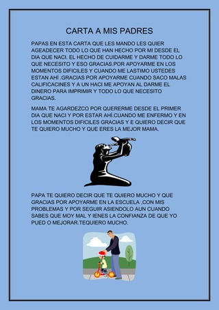 La carta agradece a los padres por todo su apoyo y cuidado desde que nació, brindándole todo lo que necesita. También les agradece por apoyarlo en los momentos difíciles y cuando saca malas calificaciones, así como por darle dinero para sus necesidades escolares. La carta expresa el gran amor y aprecio hacia la madre por quererlo desde que nació y estar ahí cuando se enferma, y hacia el padre por apoyarlo en la escuela y sus problemas a pesar de sus errores.