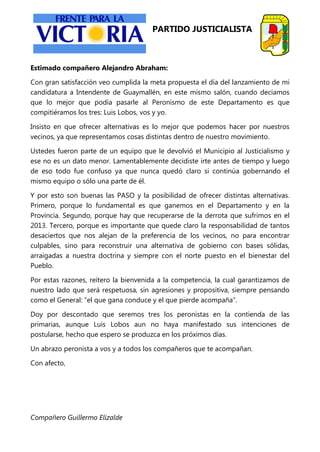 El documento es una carta de Guillermo Elizalde a Alejandro Abraham en la que: 1) Se muestra satisfecho de que haya tres candidatos peronistas compitiendo en las PASO, incluyendo a Elizalde, Abraham y Luis Lobos; 2) Insiste en que ofrecer alternativas es lo mejor para los vecinos ya que representan cosas distintas dentro del movimiento peronista; 3) Explica que las PASO son buenas para asegurar que ganen en el departamento y provincia, y para reconstruir una alternativa de gobierno só