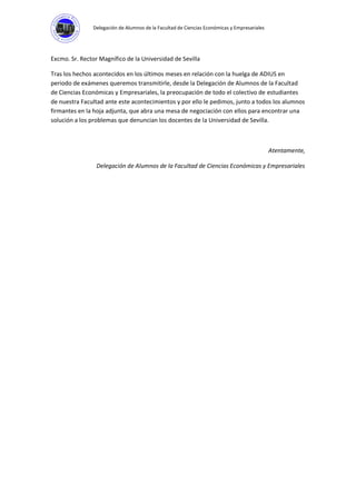 La Delegación de Alumnos de la Facultad de Ciencias Económicas y Empresariales expresa su preocupación por la huelga de profesores durante los exámenes y pide al Rector de la Universidad de Sevilla que abra negociaciones con los sindicatos para resolver los problemas que plantean y encontrar una solución.