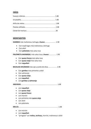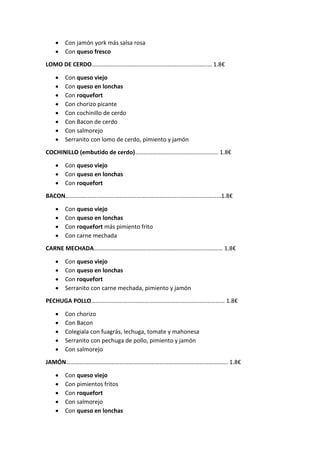 Este documento presenta una amplia variedad de opciones de montaditos, sándwiches y hamburguesas que están disponibles en un restaurante. Incluye más de 100 artículos individuales como fríos, montaditos, sándwiches normales y especiales, sándwiches de pizza, y hamburguesas de ternera con diferentes ingredientes. El documento proporciona detalles sobre los ingredientes y precios de cada artículo.