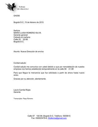 La empresa Wollemia informa a varios clientes que debido a remodelaciones se ha establecido temporalmente en una nueva dirección, en la calle 90 21-98, y solicita que la mercancía pedida sea enviada a esta nueva ubicación a partir de la fecha de la carta y hasta nuevo aviso.