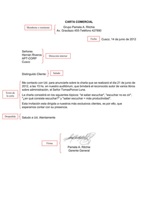 El documento es una carta comercial que invita a un exclusivo cliente a una charla sobre habilidades blandas que se realizará el 21 de junio. La charla consistirá en cuatro temas clave como "el saber escuchar" y "escuchar no es oír". Se espera la presencia del cliente en el evento.