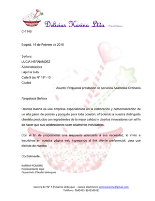 La empresa Delicias Karina le envía una propuesta de servicios a Lucía Hernández de Lápiz la zully para la elaboración y comercialización de postres y ponqués de alta gama para la asamblea ordinaria de la compañía. Delicias Karina ofrece productos con ingredientes de calidad y diseños innovadores para hacer de los eventos de sus clientes experiencias inolvidables. Se invita a Lucía Hernández a inscribirse en la página web de Delicias Karina para acceder a ofertas preferenciales.