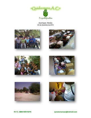 La asociación "Quiubo Mano, A.C." le agradece a la directora del Colegio Durango y a su comunidad educativa por la generosa donación de juguetes, ropa y víveres recibida en diciembre de 2010. La donación benefició a personas carentes de recursos y permitió que la asociación continúe su misión de mejorar la calidad de vida de quienes más lo necesitan. La asociación asegura que los bienes fueron entregados a personas en Axochiapan, Morelos y que no recibió