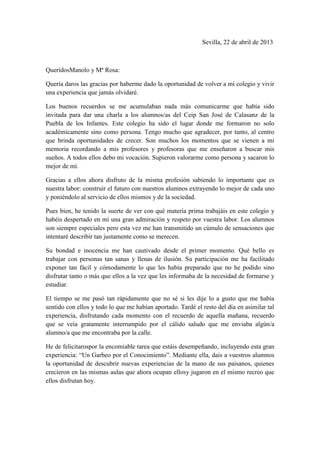 La autora agradece a los directores del colegio San José de Calasanz la oportunidad de volver a su antiguo colegio y compartir una experiencia memorable con los alumnos. Destaca la bondad e inocencia de los alumnos y lo mucho que disfrutó interactuando con ellos. Felicita a los directores por su encomiable labor formando personas y fomentando iniciativas que permiten a los alumnos descubrir nuevas experiencias.
