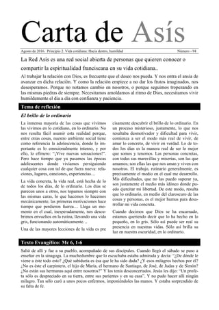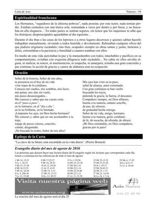 Este documento contiene varios párrafos sobre la espiritualidad franciscana y vivir la fe en la vida cotidiana. Habla de la importancia de encontrar la presencia de Dios en lo ordinario en lugar de buscar experiencias intensas o milagros. También incluye una oración pidiendo al Señor que nos ayude a ver la belleza de lo cotidiano. Por último, proporciona las referencias bíblicas para las lecturas del Evangelio durante el mes de agosto.