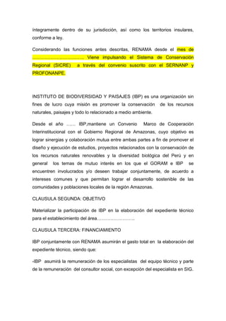 La carta establece un acuerdo entre la Gerencia Regional de Recursos Naturales y Gestión del Medio Ambiente (RENAMA) y el Instituto de Biodiversidad y Paisajes (IBP) para elaborar un expediente técnico para el establecimiento de un área de conservación. IBP y RENAMA compartirán los costos del proyecto, con IBP financiando a los consultores y RENAMA financiando los gastos operativos con fondos de PRONANP. IBP representará al Gobierno Regional de Amazonas durante el trabajo de campo. El acuer