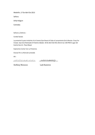 La presente Es para Invitarles A Un Evento Que llevara A Cabo el Lanzamiento De la Revista Crazy For