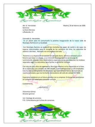 La carta anuncia la próxima inauguración de una nueva sede de Reciclajes Ramírez en la localidad del Sr. Hernández. Reciclajes Ramírez ofrece servicios de recogida diaria, alterna o semanal de residuos separados como papel, cartón, cajas, plástico o latas para su posterior reciclaje. La empresa tiene más de cinco años de experiencia y 300 clientes.