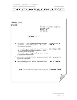 Este documento ofrece información sobre cartas de presentación, incluyendo su objetivo, estructura y tipos. Explica que una carta de presentación tiene como objetivo captar la atención del receptor y conseguir una entrevista. Describe los tres tipos principales de cartas de presentación - carta de respuesta a un anuncio, carta de autocandidatura y carta de agradecimiento - y proporciona consejos sobre cómo elaborar una carta de presentación efectiva, como resaltar los puntos fuertes y motivar el interés en la empresa.