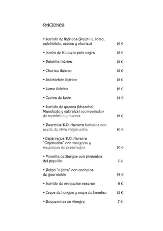 Este documento presenta una lista de raciones y precios de un restaurante. Ofrece una variedad de opciones como anchoas, alcachofas con jamón ibérico, pimientos rellenos de bacalao y ventresca de bonito. También incluye ibéricos como paletilla, lomo y chorizo, así como quesos, espárragos, morcilla y pulpo gallego. Los precios van desde 7€ a 18€.