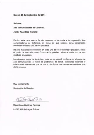 Maximiliano Gutiérrez Ramírez presenta su renuncia a la corporación Aso comunicadores de Colombia debido a problemas de salud, obligaciones laborales y dificultades familiares que le impiden continuar participando. Les desea éxito en sus proyectos y objetivos.