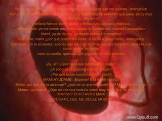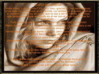 Este documento es una carta escrita por un bebé no nacido dirigida a su madre. El bebé expresa su felicidad por haber sido concebido y describe el proceso de formación de su cuerpo en el útero durante los primeros meses. Sin embargo, nota que su madre está triste y llora constantemente. Finalmente, el bebé es sometido a un aborto, lo que le causa un gran dolor físico y emocional. Años más tarde, el bebé le recuerda a su madre su amor por ella a pesar de la dolor