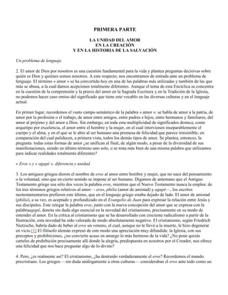 Este documento es la introducción de la encíclica Deus Caritas Est del Papa Benedicto XVI sobre el amor cristiano. En la introducción, el Papa describe el amor como el corazón de la fe cristiana y explica que los cristianos creen en el amor de Dios. También discute el significado de las palabras griegas "eros" y "agapé" para el amor y cómo el cristianismo transformó la comprensión del eros. Finalmente, señala que el amor necesita purificación y maduración para alcanzar su verd