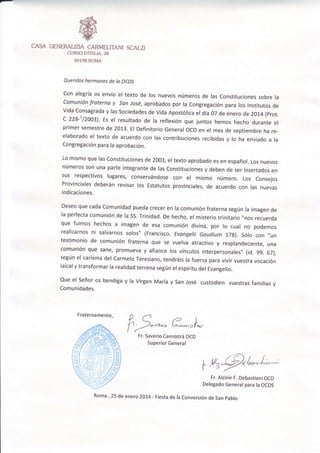 El Superior General de los Carmelitas Descalzos envía a los miembros de la Orden de la Virgen del Monte Carmelo (OCDS) los nuevos números de las constituciones sobre la comunión fraterna y san José, aprobados por la Congregación para los Institutos de Vida Consagrada. El texto aprobado en español debe insertarse en las Constituciones manteniendo el mismo número. Los consejos provinciales deben revisar los estatutos provinciales de acuerdo con las nuevas indicaciones.