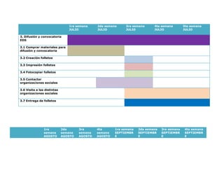 El documento presenta un cronograma de actividades para la implementación de 8 talleres como parte de un Espacio de Desarrollo Social (EDS). Las actividades incluyen el diseño e implementación de los talleres sobre habilidades dirigenciales, gestión territorial, computación, leyes, e innovación entre mayo de 2022 y junio de 2023, culminando con una ceremonia de certificación.