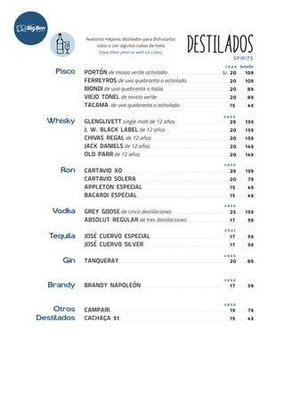 El documento presenta una extensa lista de cocteles, destilados, vinos y otras bebidas disponibles en el restaurante Huanchaco. Destaca cocteles clásicos como Pisco Sour, Margarita y Mojito, así como una variedad de destilados y una selección de vinos atractivos. También incluye información sobre cervezas y cafés especiales, creando un amplio menú de opciones para los visitantes.