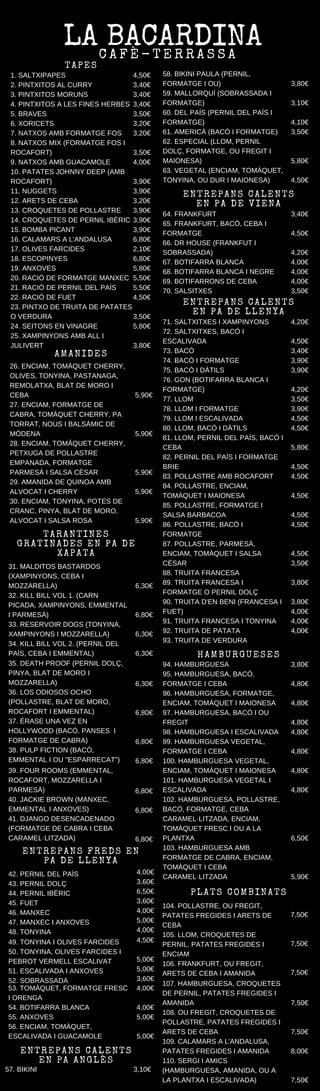 Este documento contiene la carta de un restaurante que ofrece una variedad de pinchos, ensaladas, bocadillos calientes y platos combinados. La carta incluye más de 100 opciones de comida como pinchos, ensaladas, bocadillos de diferentes tipos de pan, hamburguesas y platillos combinados. Cada plato viene acompañado de su precio.