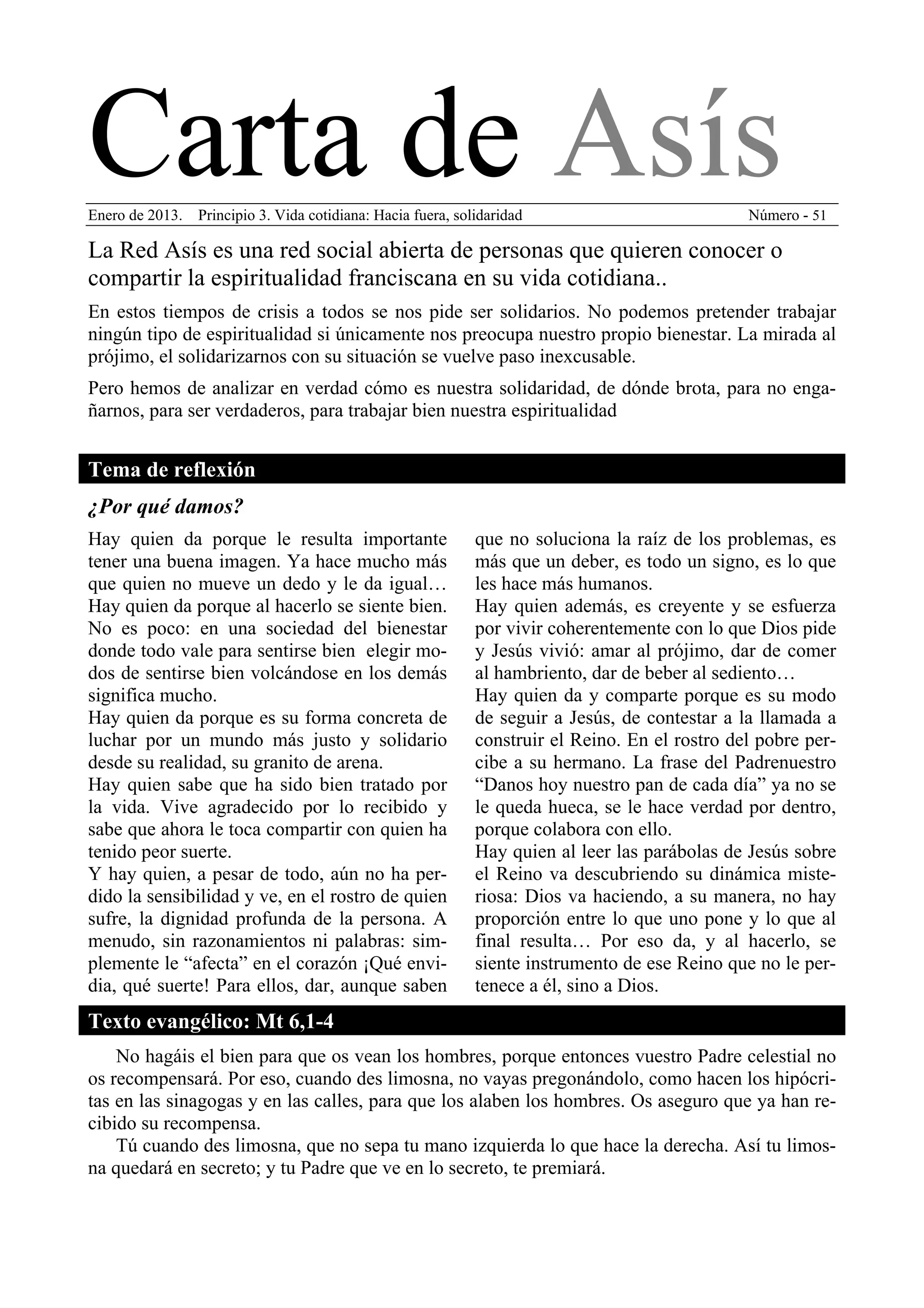 1) La Carta de Asís habla sobre la importancia de la solidaridad y compartir con los demás, especialmente en tiempos de crisis.