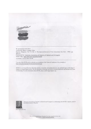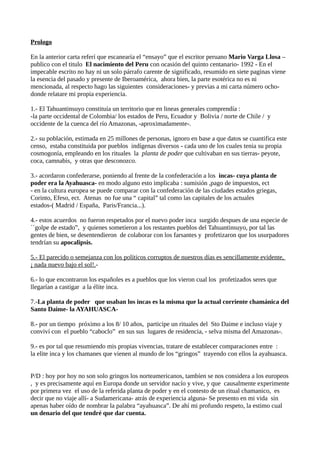 El documento resume la historia y cultura del Imperio Inca antes de la llegada de los españoles. Explica que el Tahuantinsuyo abarcaba partes de varios países de América del Sur y que sus pueblos tenían diferentes cosmogonías y plantas sagradas. También describe cómo los incas sometieron a otros pueblos a través de un golpe de estado y cómo los españoles fueron vistos como castigo a la élite inca. Finalmente, hace comparaciones entre la elite inca y los chamanes modernos que usan la ayahuasca