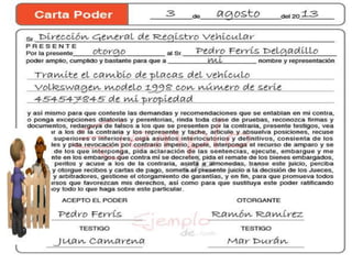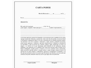 El documento habla sobre la elaboración de una carta poder. Explica que una carta poder es un documento legal que permite a una persona otorgar poderes a otra para que realice ciertas acciones en su nombre. También describe los elementos que debe contener una carta poder como quien la otorga, quien la recibe, para qué se otorga el poder y la fecha de vigencia. Finalmente, enfatiza la importancia de contar con una firma única que acredite la identidad de una persona en documentos legales.