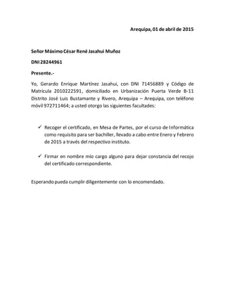Gerardo Martínez Jasahui otorga poder a Máximo César René Jasahui para que recoja un certificado de un curso de informática en su nombre y firme cualquier documento requerido para dejar constancia del recojo.