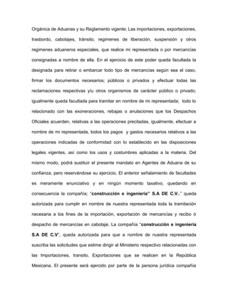 El documento otorga un poder especial a la compañía "construcción e ingeniería S.A DE C.V" para que represente a la Sociedad Mercantil construcción e ingeniería S.A DE C.V en asuntos aduaneros ante las aduanas mexicanas, incluyendo importaciones, exportaciones y regímenes aduaneros especiales. La compañía "construcción e ingeniería S.A DE C.V" podrá designar agentes para llevar a cabo estas funciones en nombre de la Sociedad Mercantil construcción e ingeniería S.