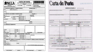 El documento describe los elementos clave de una carta de porte terrestre, que es el documento que refleja el contrato de transporte de mercancías y justifica el desplazamiento de bienes peligrosos. La carta de porte debe incluir el nombre y dirección del cargador, porteador y consignatario, una descripción de los bienes, peso y marcas, el precio del transporte, fecha de expedición, lugares de entrega al porteador y consignatario, y cualquier indemnización por retraso acordada.