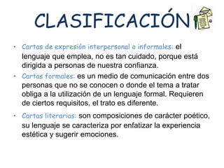 La carta es un texto escrito producido por un emisor para enviar a un receptor. Se clasifican en cartas informales entre personas cercanas, formales entre desconocidos donde se requiere un lenguaje formal, y literarias con un estilo poético. Los factores que determinan su clasificación son la relación entre emisor y receptor, la intencionalidad del emisor, y el contenido global. Una carta típica contiene secciones como membrete, fecha, datos de destinatario, saludo, cuerpo con tres párrafos, saludo