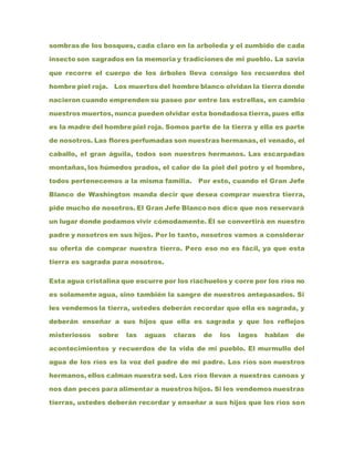 El Jefe Seattle responde a la oferta del Presidente Franklin Pierce de comprar las tierras de los indios Swamish. En su respuesta, el Jefe Seattle expresa que la tierra es sagrada para su pueblo y parte integral de su cultura e identidad. Explica que la tierra, el agua, el aire y los animales son como familia para ellos. Advierte que si venden la tierra, los estadounidenses blancos deben recordar su sagrado significado y enseñar a sus hijos a respetar y cuidar la tierra y todo lo que ella contiene.